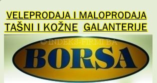 BORSA Mostar- veleprodaja u Širokom Brijegu Ogroman izbor tašni, galanterije, artikala od kože od najosnovnijih do brendiranih i aktuelnih evropskih modela, namjenjenih širokom spektru kupaca, i za sve vrste butika i prodavnica slične opreme sa veletrgovinskom cijenom.-Široki Brijeg Borsa - prodajni objekat u Starom tržnom centru Jedan od objekata Borsa, nalazi se u tržnom centru u Mostaru.Izabrani modeli tašni, cipela i kožne galanterije, izuzetno moderni i dizajnirani modeli privlače pažnju posebno ženskog djela omladine, gdje mogu pronaći gotovo sve evropske stilove i aktuelne dizajne. Borsa - prodajni objekat kod Mostarke Uz poznatu zgradu "Mostarka", veliki broj modela tašni za sve prilike, ukrašava ovaj dio grada i poznati kvart.